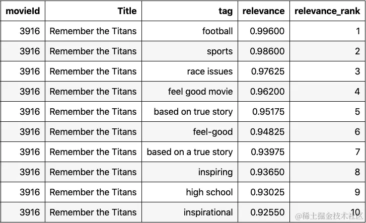 并不是每个标签都与电影相关,所以我们只需要保留最相关的标签。首先,我们可以根据相关评分对每部电影的标签进行排序。例如,下面是Remember the Titans的top10标签。请注意,相关性评分远远高于0.9,这表明它们是非常相关的标签。