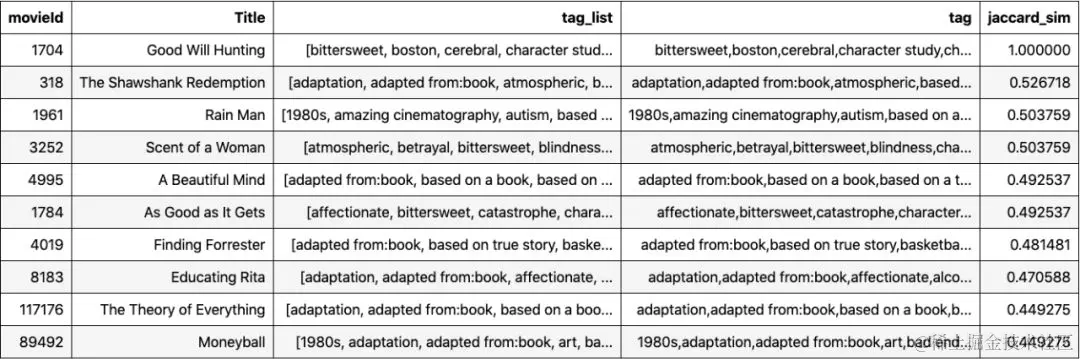 请记住,在基于内容的推荐系统中,用户将被推荐与他们已经看过的电影相似的电影。如果用户只看过一部电影(如Good Will Hunting),我们可以像以前一样简单地使用Jaccard Index(或余弦相似度)来生成要推荐的类似电影的列表。