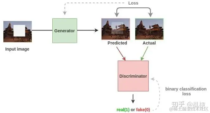 之后使用 GAN 模型,将图像中抠出一块区域所得的残留图(区域出现的上下文)作为输入,训练模型修复出完整图像。在训练时,使用对抗损失作为生成器的损失函数,使用二分类损失作为判别器的损失函数,对生成器和判别器进行对抗训练。