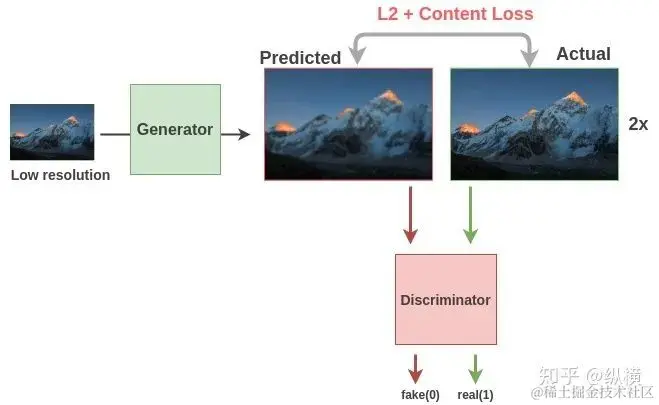 之后使用 GAN 模型,将小图作为输入重构高分辨率图像。在训练时,将重构的高分辨率图像与原图的 MSE(L2 距离)、内容损失(Content Loss)和对抗损失作为生成器的损失函数,将二分类损失作为判别器的损失函数,将生成器和判别器进行对抗训练。