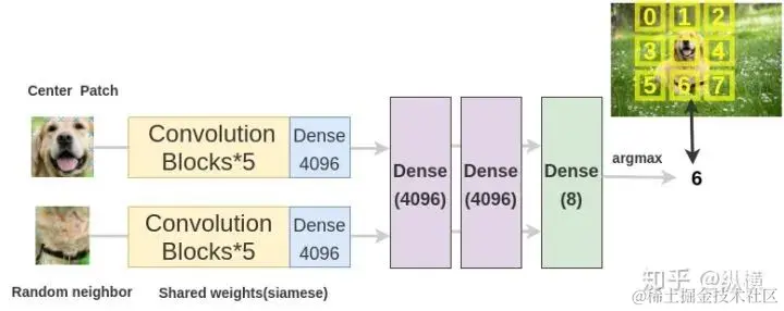 之后使用 CNN-based 的分类器,将中心区域和某一块相邻区域作为输入,用共享权重的特征提取器分别提取特征,合并两区域的特征并通过 MLP 输出相邻区域相对中心区域的方向(例如 6 是下)。在训练时,使用多分类损失作为损失训练分类器学习相对位置信息。