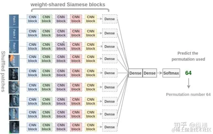 现有工作一般先将图像分成 9 块 Patch,定义对 9 块 Patch 的 64 种打乱方式,每次从 64 种打乱方式里随机选一种进行打乱。