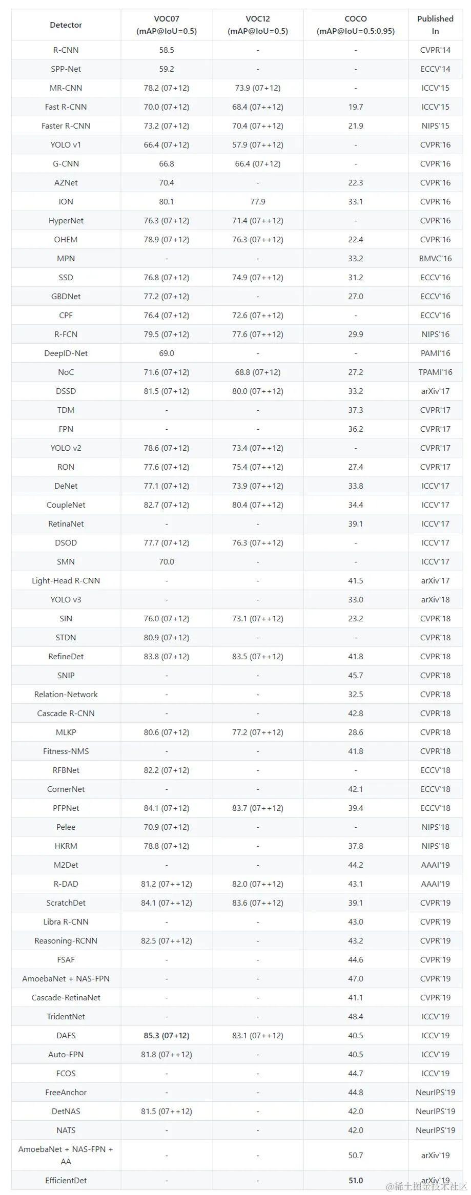 从上面的表格中,可以清楚看到不同模型在 VOC07、VOC12、COCO 数据集上的性能表现。同时列出了模型论文发表来源。\