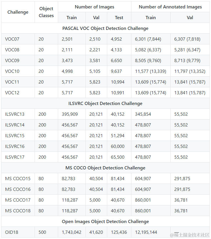 同时作者也列出了以上模型通常使用的公开数据集:VOC、ILSVRC、COCO,如下表所示: