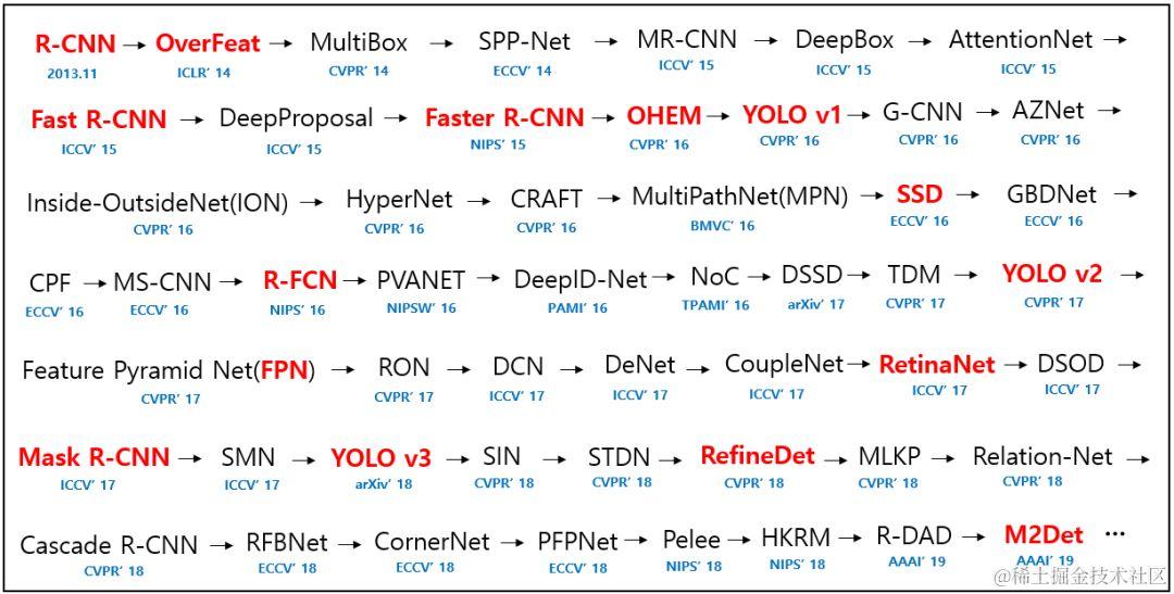 该技术路线纵贯的时间线是 2013 年到 2020 年初,上图总结了这期间目标检测所有具有代表性的模型。图中标红的部分是相对来说比较重要,需要重点掌握的模型。