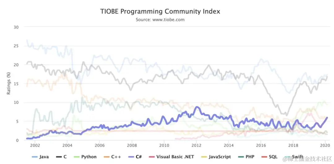 我刚刚查了一下(见下图),C# 还是挺热门的编程语言,没到不太好就业的地步,别随便听信别人的话,要学会自己去判断。Python 是门不错的编程语言,增长势头很猛,但远没到那种独霸天下的地步。