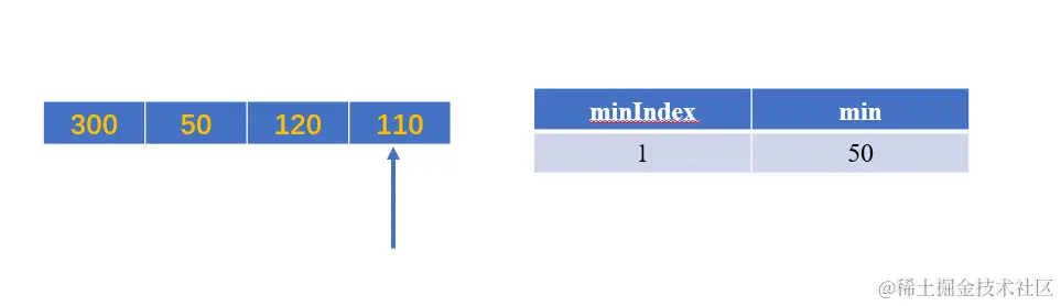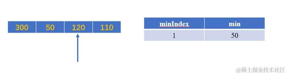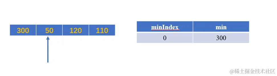 此时 50 < min当前值300,将minIndex赋值为1,将min赋值为50;