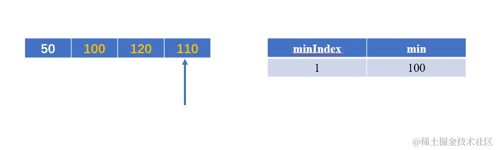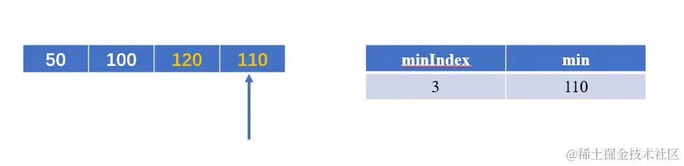 此时 110 < min当前值120,将minIndex赋值为3,将min赋值为110;
