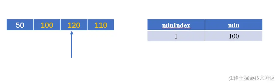 此时 120 > min当前值100,循环变量直接向后移动;