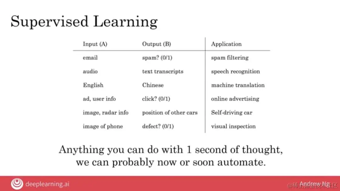 这项概念是吴恩达教授在课程里所提到的**「一秒原则」**,可以让你用来判断一个任务是否能用AI做自动化的准则。通过监督式学习以及大量成对A&B数据,我们可以让很多以往被认为非常复杂,但人脑仅需1秒钟就能解决的任务透过AI来自动化,让我们的生活更加轻松。