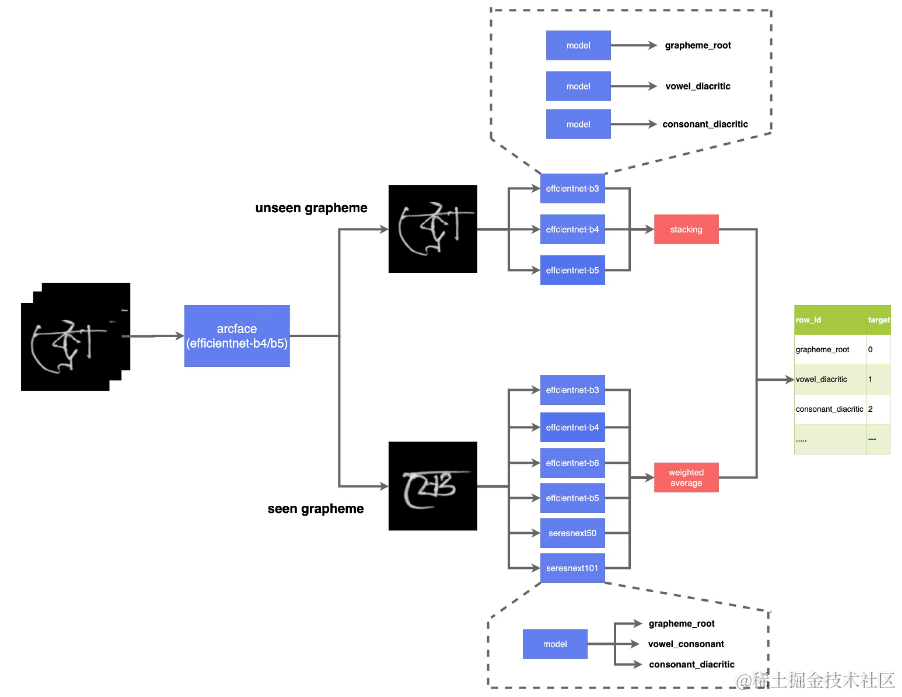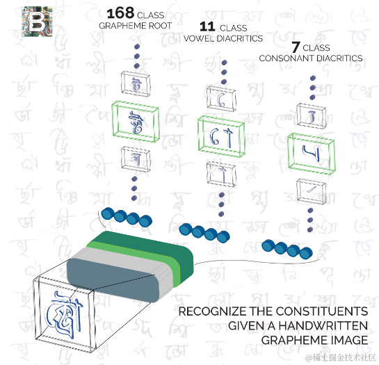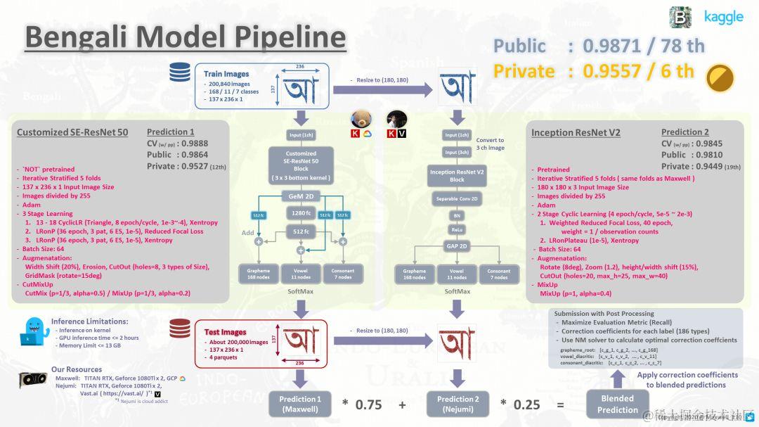 比赛任务需要对每一个字符识别的三个元素类别,因此这个比赛的任务是很常见的CNN分类任务,只不过Bengali是三个类别的多类别分类比赛。这个比赛非常有意思,竟然让榜单shake的天翻地覆,过拟合A榜简直不要太简单: