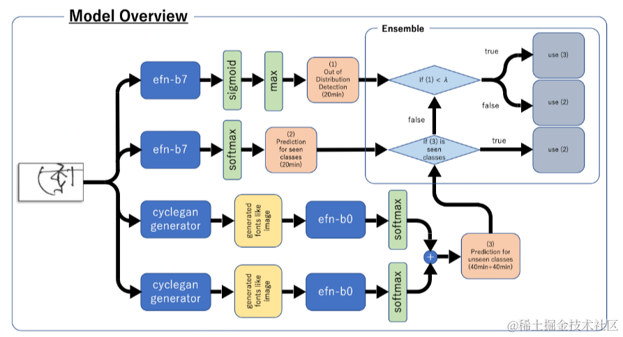 第一名的方法非常清晰,通过ttf字体文件生成了unseen的样本,同时利用CycleGAN进行风格转换操作,这些都是认真分析赛题后做的。第一名整体的流程可以参考Model Overview图。