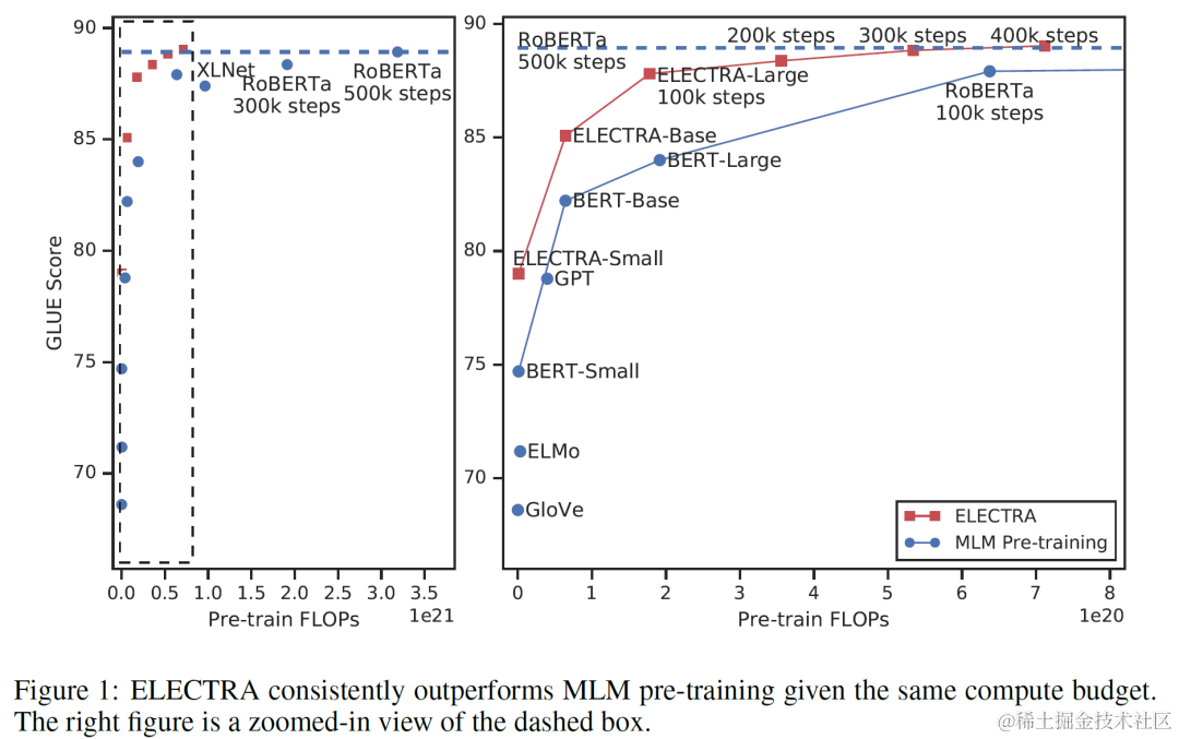 在此背景下,ELECTRA另辟蹊径,抛弃传统的MLM(masked language model)任务(详情见BERT介绍),提出了全新的replaced token detection任务,使得模型在保持性能的前提下大大降低了模型参数量,提高了模型的运算速度。