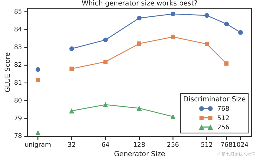 实验得到,在保持generator和discriminator大小相同的情况下,不共享权重的GLUE score是83.6,共享token embeddings的GLUE score是84.3,共享所有权重的score是84.4。论文分析,这是因为generator对token embedding有着更好的学习能力,因此共享token embeddings后discriminator也能获得更好的token embeddings。