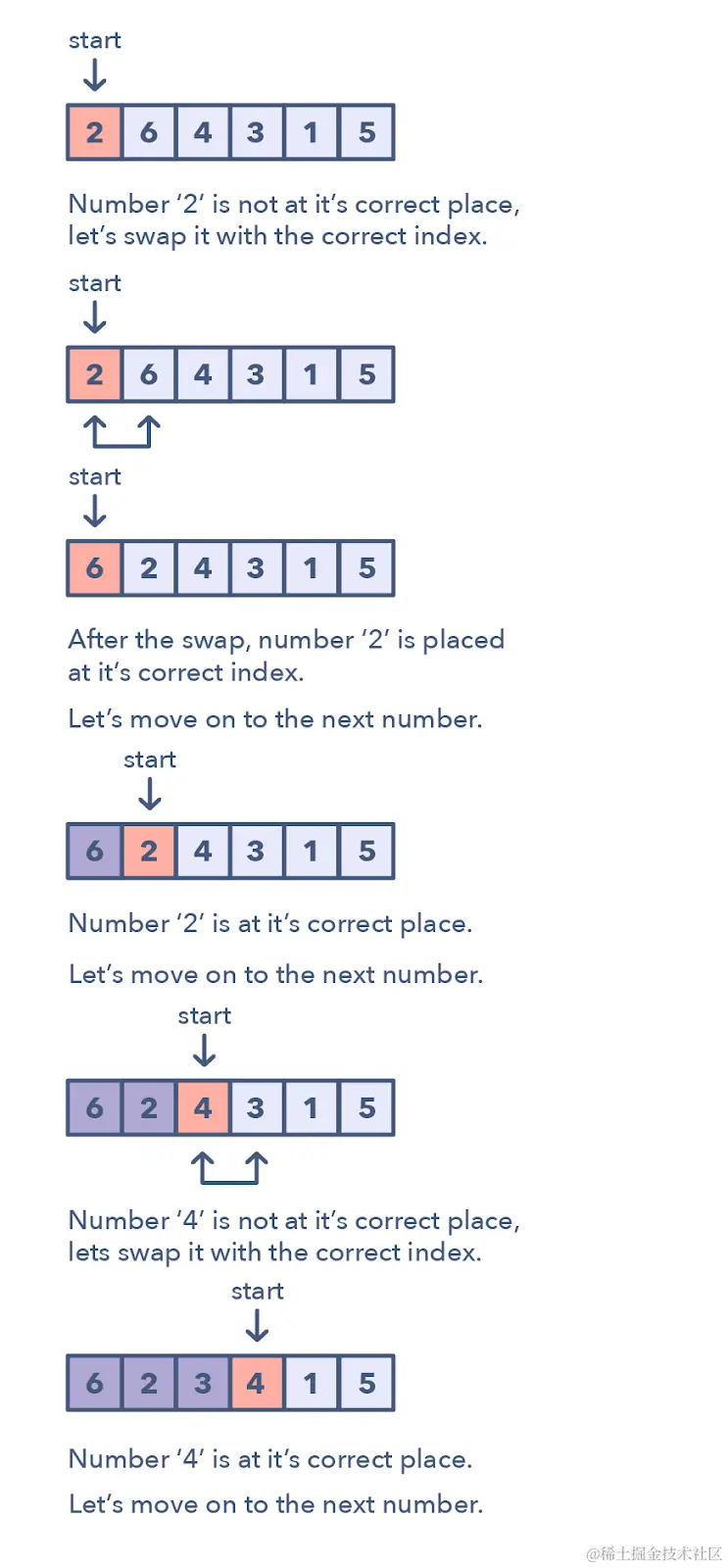 循环排序模式描述了一种处理涉及包含给定范围内的数字的数组问题的有趣方法。其一次遍历数组一个数字,如果正在迭代的当前数字不是正确的索引,则将其与正确索引处的数字交换。