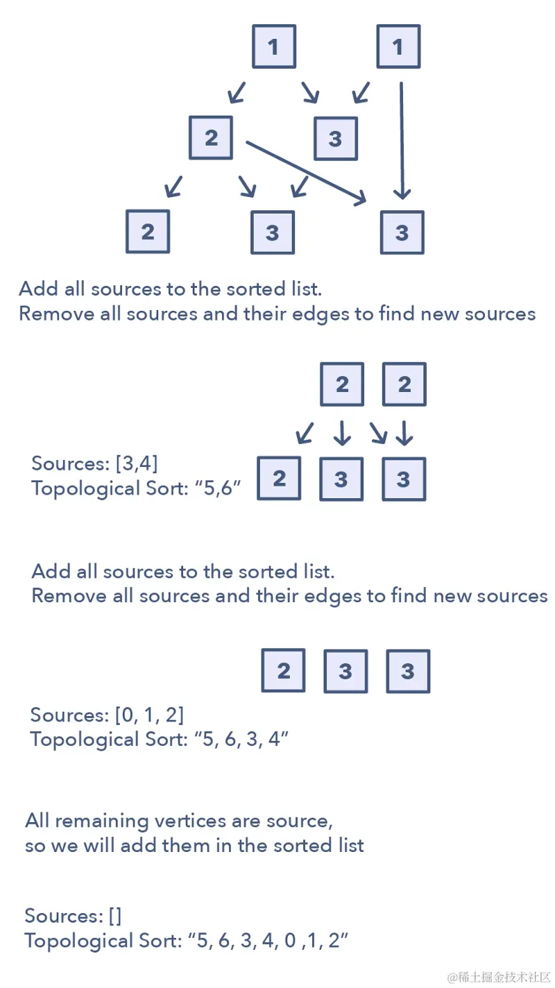 拓扑排序用于查找彼此依赖的元素的线性排序。例如,如果事件“B”依赖于事件“A”,则“A”在拓扑排序中位于“B”之前。流程大概是这样的: