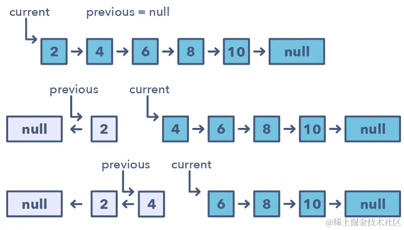 此模式一次反转一个节点,从一个指向链表头部的变量(当前)开始,一个变量(上一个)将指向已处理的上一个节点。以锁步方式,将通过将当前节点指向前一个节点,然后再转到下一个节点来反转当前节点。此外,更新变量“previous”以始终指向您已处理的上一个节点。