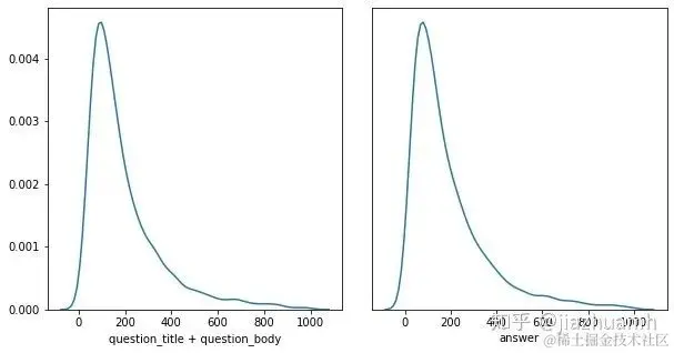 真实的数据集中,每条数据的文本长度是不相同的,一般呈现长尾分布,需要简单的分析然后确定一个 Seq Length。以 Google QUEST Q&A Labeling 比赛为例,文本特征包括 question_title、question_body 和 answer,tokenize 后分布如下: