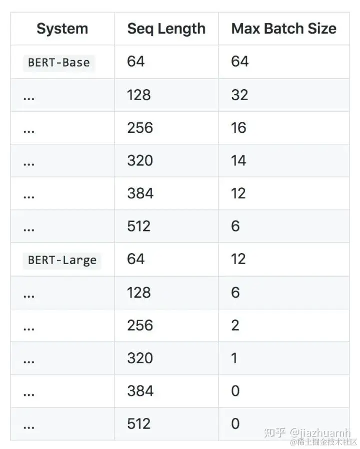 需要注意的是 tokens 总长度的限制(Seq Length):一方面是硬性限制,即不能超过 512;另一方面是资源限制,GPU 显存消耗会随着 Seq Length 的增加而显著增加。下面表格是 Google 给出的在单个 Titan X GPU(12G RAM) 上 Bert 的资源消耗情况。