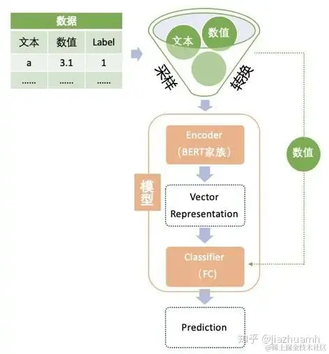 粉色的是模型部分,我把它拆成了两块 Encoder 和 Classifier,在实际使用中其实是放在同一个神经网络里的。拆开表示主要是因为 Encoder 部分就是我们所谓的预训练语言模型,不论是网络结构还是权重都是现成的,我们直接拿来用,基本不需要做改动;而 Classifier 部分是随着任务的不同而改变的,它一般是一层或多层全连接网络(FCNN)。大致的流程是文本特征(也可以有 meta 特征)经过 Encoder 层会被编码成向量表示(Vector Representation),再通过 Classifier 得到最终的预测结果。