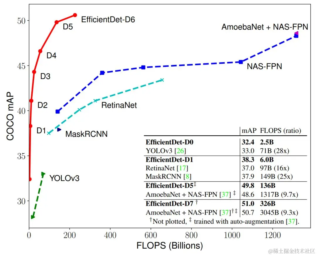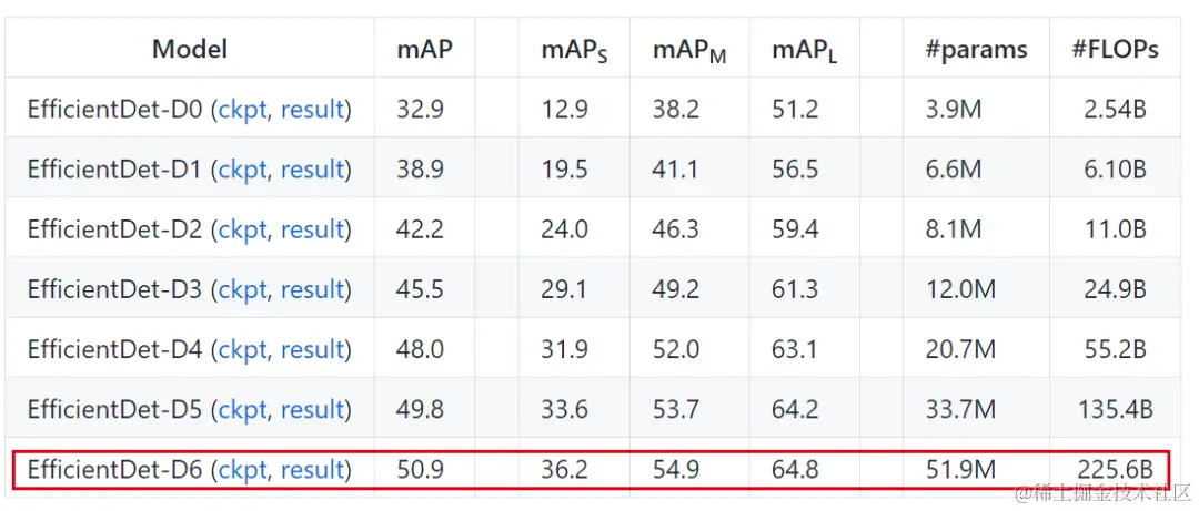 不过要注意的是目前开源的是EfficientDet-D0到EfficientDet-D6,原论文中的EfficientDet-D7没有了(而且新论文修正了这一点,也是把EfficientDet-D7删掉了)。不过问题不大,EfficientDet-D6 的 51.0 mAP 也够我们用了!