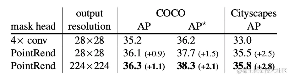 将PointRend与表1中Mask R-CNN中默认的4×conv head进行比较。