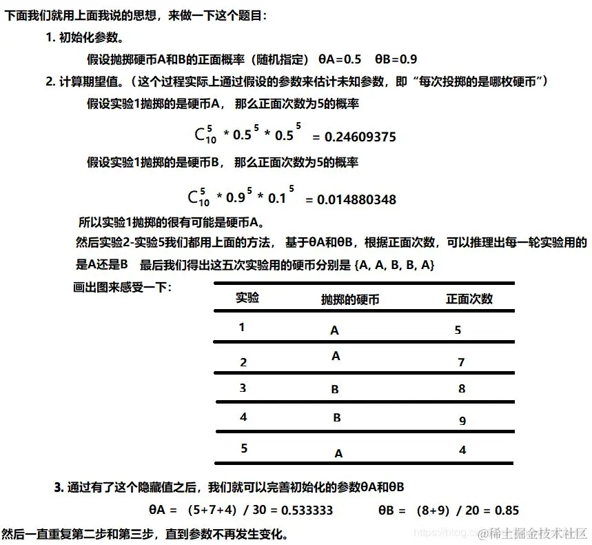 PS:上面这个表我只是为了说明意思,截取过来的一个图,真实数据并不是这样的数据,看第一轮也能看出来,真实数据是我上面计算的那个,按照那个计算方法,计算出每一轮的硬币A的时候正面和反面的数据,硬币B的正面和方面的数据,然后求新的θA和θB会更加准确一些。”