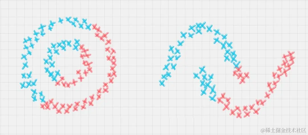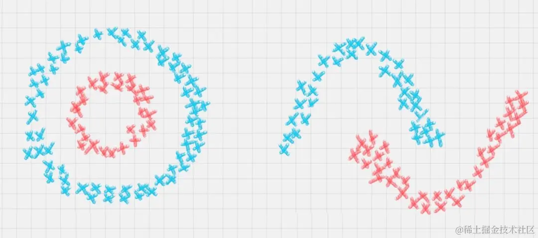 你可以把 EM 算法理解成为是一个框架,在这个框架中可以采用不同的模型来用 EM 进行求解。常用的 EM 聚类有 GMM 高斯混合模型和 HMM 隐马尔科夫模型。GMM(高斯混合模型)聚类就是 EM 聚类的一种。比如上面这两个图,可以采用 GMM 来进行聚类。