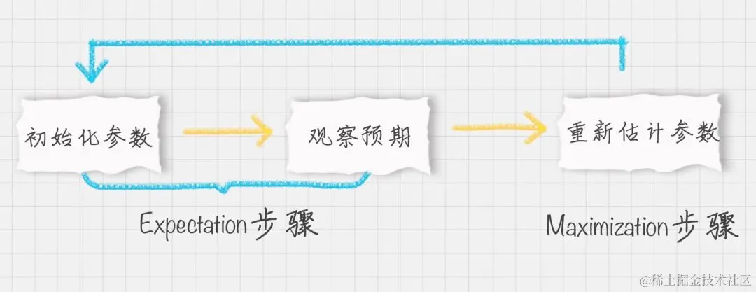你能看出 EM 算法中的 E 步骤就是通过旧的参数来计算隐藏变量。然后在 M 步骤中,通过得到的隐藏变量的结果来重新估计参数。直到参数不再发生变化,得到我们想要的结果。