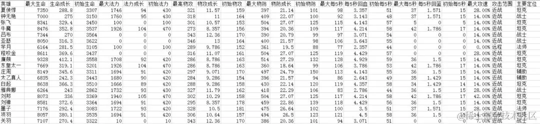 看看数据的样子:数据集在这里下载这里我们收集了 69 名英雄的 20 个特征属性,这些属性分别是最大生命、生命成长、初始生命、最大法力、法力成长、初始法力、最高物攻、物攻成长、初始物攻、最大物防、物防成长、初始物防、最大每 5 秒回血、每 5 秒回血成长、初始每 5 秒回血、最大每 5 秒回蓝、每 5 秒回蓝成长、初始每 5 秒回蓝、最大攻速和攻击范围等。