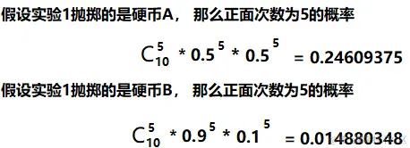 你没有发现,这样做决定太硬,太绝对了吗? 虽然B出现正面次数为5的概率比A的小,但是也不是0啊,就是也有可能出现啊。这时候我们应该考虑进这种可能的情况,那么这时候,第一轮实验用的A的概率就是: 0.246 / (0.246 + 0.015) = 0.9425;用B的概率就是1-0.9425 = 0.0575。