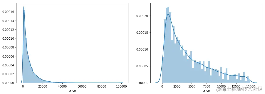 且预测值price出现负数,查看price分布 出现长尾分布 不符合正态分布。