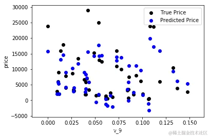 绘制特征v_9的值与标签的散点图,图片发现模型的预测结果(蓝色点)与真实标签(黑色点)的分布差异较大。