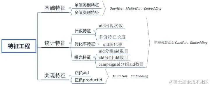 特征主要分为了用户特征和广告特征两个大类,全部特征的都categorical的,即用一个整数表示类别。广告特征比较少,而用户特征的数量则多比较多,包括age,gender等简单的onehot类特征,也包含了interest,topic等不定长的向量特征。