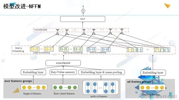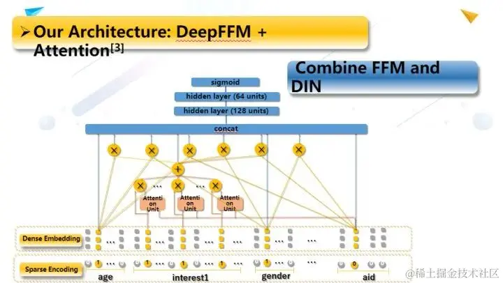 本次比赛中的最优效果的模型为nffm模型,该结构组成主要为:shallow part是LR,deep part是ffm embedding + fcs(全连接层)。