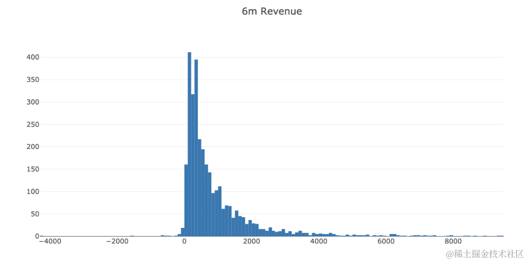 既然我们的特征集已经准备好了,我们为每个客户计算6个月的LTV,我们将使用这些LTV来训练我们的模型。\