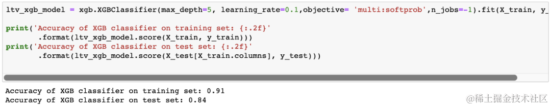 ltv_xgb_model = xgb.XGBClassifier(max_depth=5, learning_rate=0.1,objective= 'multi:softprob',n_jobs=-1).fit(X_train, y_train)