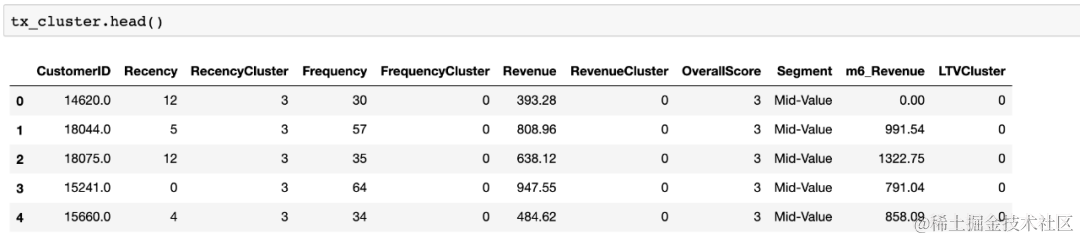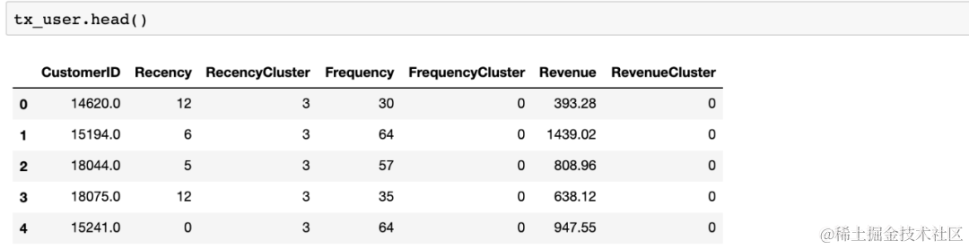 我们已经创建好了我们的RFM评分,现在我们的特征集合如下:
