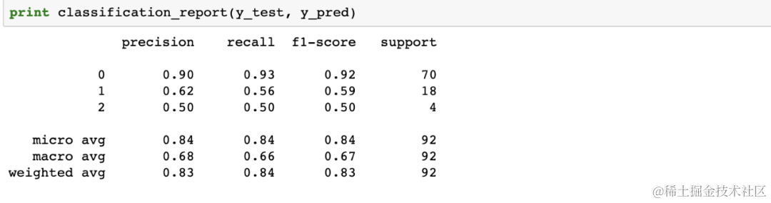 首先,我们需要检查基准测试。最大的cluster 是0号cluster,占总数的76.5%。如果我们盲目地说每个客户都属于cluster 0,那么我们的准确率将达到76.5%。84%对76.5%告诉我们,我们的机器学习模型是有用的,但肯定需要改进。我们应该找出模型的不足之处。我们可以通过查看分类报告来识别: