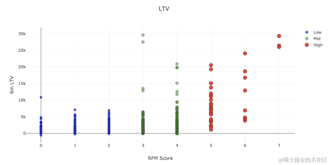 正相关是很明显的。高RFM分数意味着高LTV。\