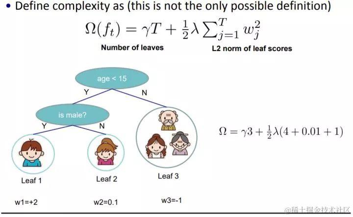 - 在目标函数中添加了正则化。叶子节点个数+叶子节点权重的L2正则化。