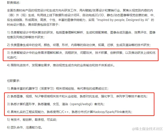我们可以着重来看一下上面用红色圈起来的部分,我们先来看下第一个招聘JD,在职位描述中,这个JD很明确的指出了,需要做业务需求的理解和解决,问题的公关,创新探索和推动研发上线,而在下面的任职要求中,我们也可以看到,他所要求的不仅仅是你对CV这一个专业领域的积累,更重要的是你对深度学习的其他技术,如对抗生成、强化学习等技术的熟练程度,以及对Hadoop、分布式、实时流计算等有着扎实的基础。