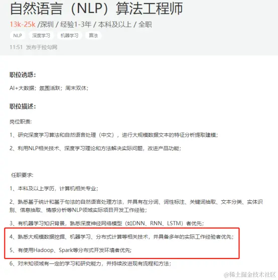 这个时候有人可能会说,那如果我就是找NLP开发工程师,或者NLP高级工程师,那会不会就只会NLP技术就可以了呢?我们再来看另外一份JD。