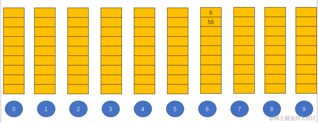 56的个位数也为6,所以也将其放入代表数字6的桶;