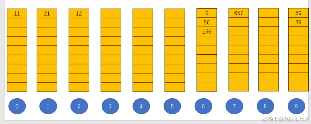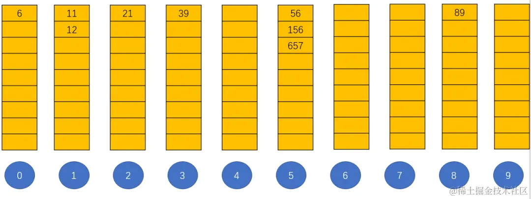如此将它们按照十位数字进行装桶如下: