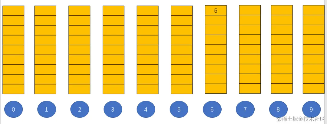 第一轮先按照个位数进行装桶,6的个位数为6,所以将其放入代表数字6的桶;