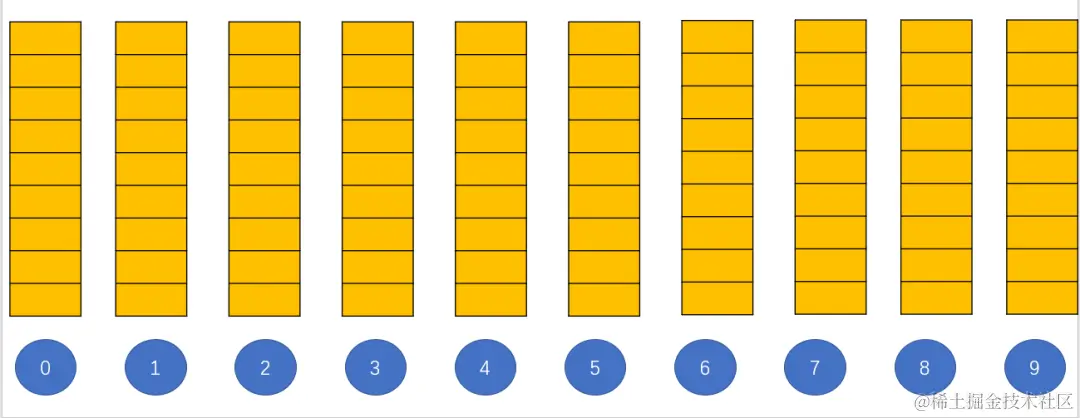 十进制的每位数字都是从0-9的,所以我们分配10个桶,每个桶有一定的容量(本文将设定为数组长度大小);