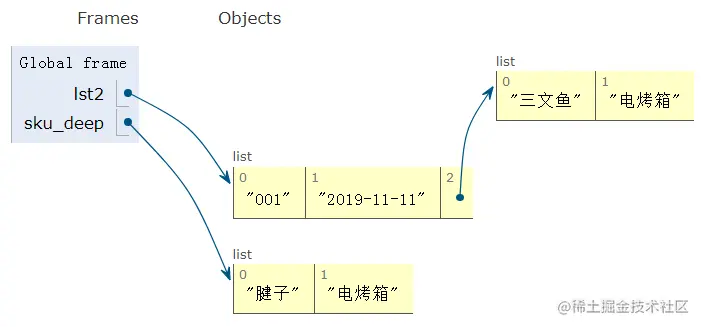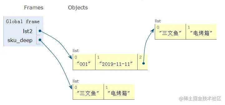 此时可视化图为如下,因为拷贝 lst2[2],所以 sku_deep 位于栈帧中指向一块新的内存空间: