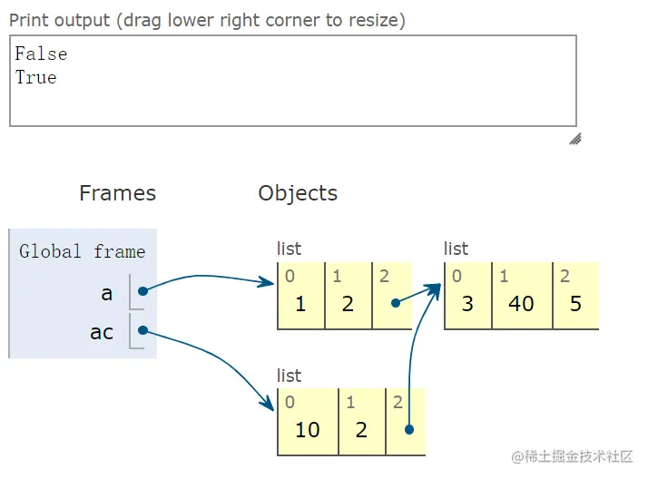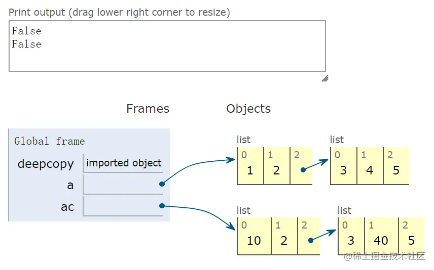 打印结果,都为 False,结合下图,也能看出内嵌的 list 全部完成复制,都指向了不同的内存区域。