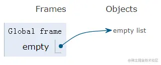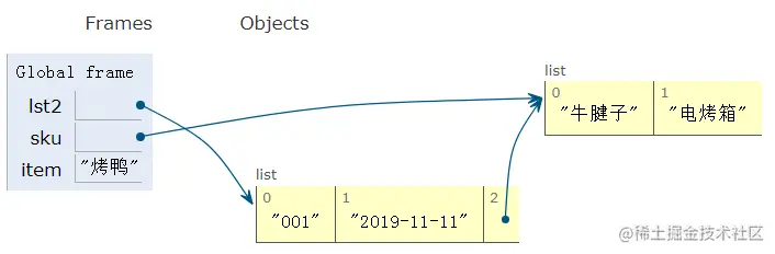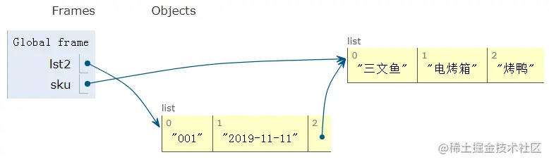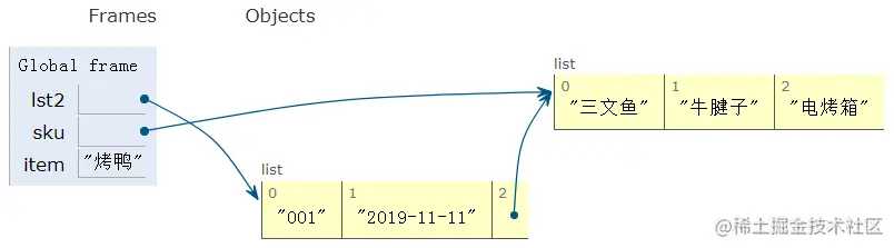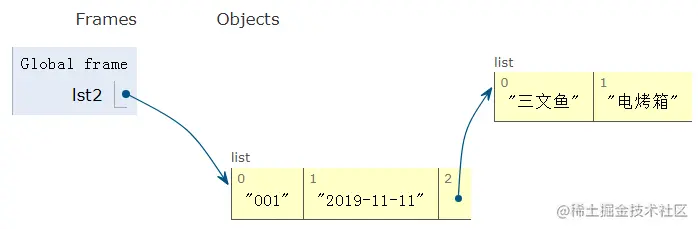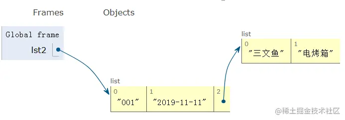 可视化此行代码,lst2 位于全局帧栈中,其中三个元素内存中的可视化图如下所示: